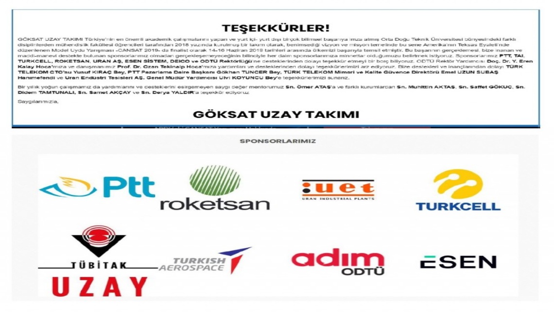As UET Uran Industrial Plants Construction and Trade Inc., GÖKSAT SPACE TEAM, founded by engineering students at Middle East Technical University, which we sponsor, successfully represented our country as a finalist in the world's most prestigious Model Satellite Competition CANSAT 2019, held in Texas , USA and supported by NASA, between June 14-16, 2019, and ranked 13th worldwide among 40 teams that made it to the finals. We congratulate them and wish them continued success.