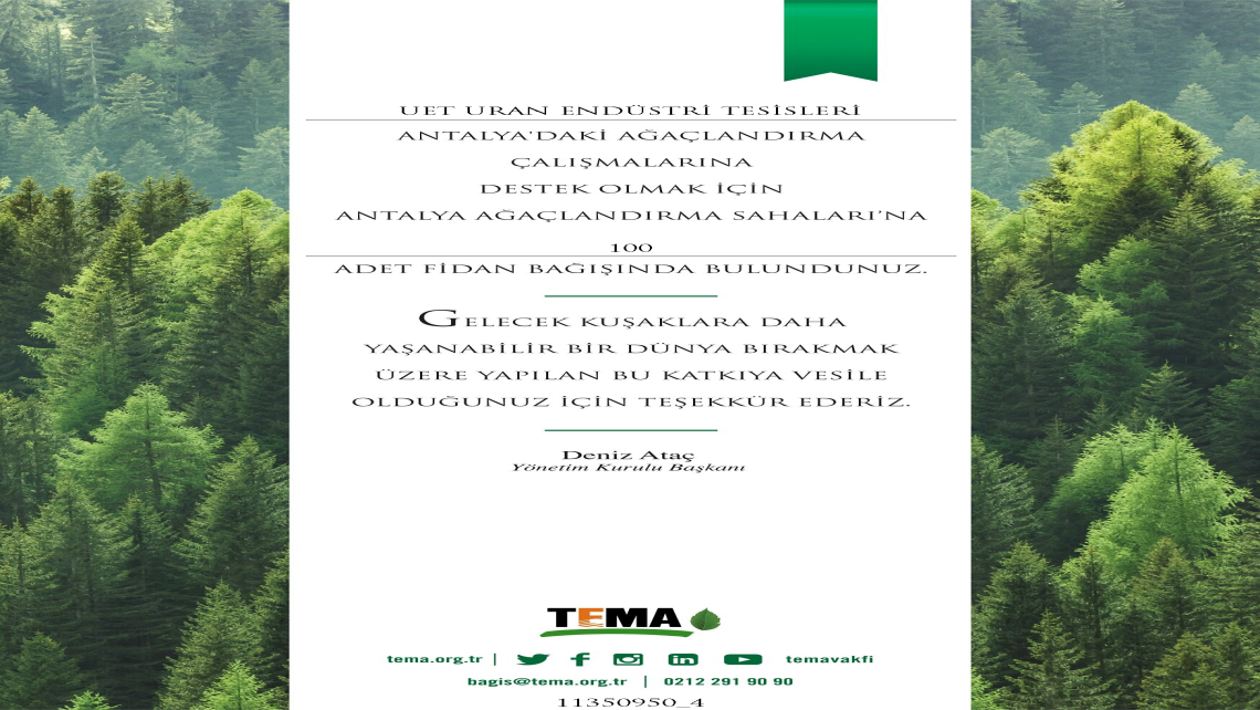 Ülkemizin çeşitli bölgelerinde gerçekleşen ve hala devam etmekte olan yangın söndürme çalışmaları sırasında hayatını kaybeden vatandaşlarımıza rahmet, yaralı vatandaşlarımıza acil şifalar dileriz. UET Uran Endüstri Tesisleri olarak ormanlarımızın yeniden yeşertilmesi için çalışanlarımız adına 100 adet fidan bağısında bulunduk.
